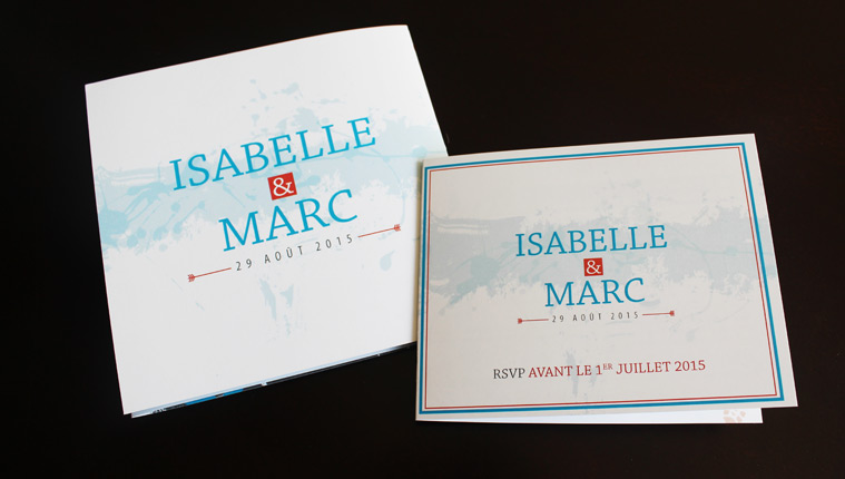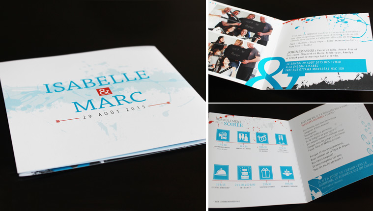 Réalisation d’une invitation de mariage avec 3 plis. Format 5.5″ x 5.5″. Le thème est la peinture, les galeries artistiques. L’intégration de photos de famille ainsi que de pictogramme était très important pour les clients.