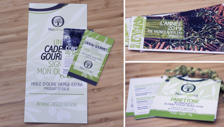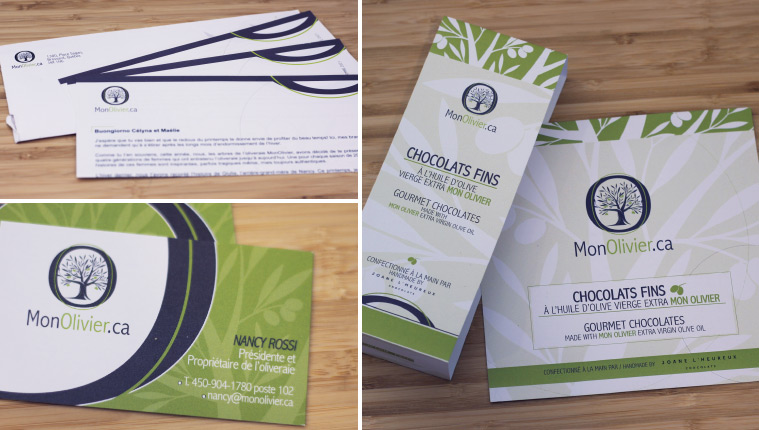 Création du logo de Mon Olivier en représentant l’olive. Création d’une carte d’affaire, d’une étiquette pour les bouteilles d’huile d’olive, création de lettres personnalisées, création de carton promotionnel, création de carton pour offrir en cadeau, création du visuel pour un coffret de chocolat, mise à jour de leur site internet bien plus…
