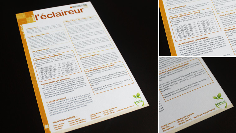 – Création d’un gabarit pour le journal mensuel (l’Éclaireur) des Promenades Saint-Bruno. Ce journal permet aux commerçants et à l’administration d’afficher des promotions ou tout autre informations utiles aux autres commerçants du centre.
